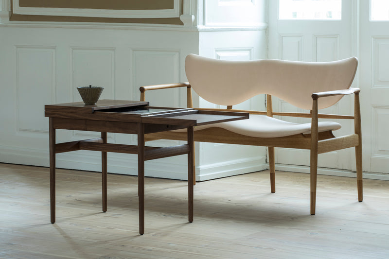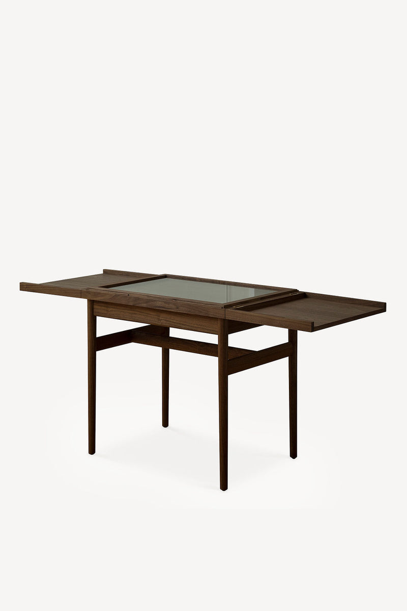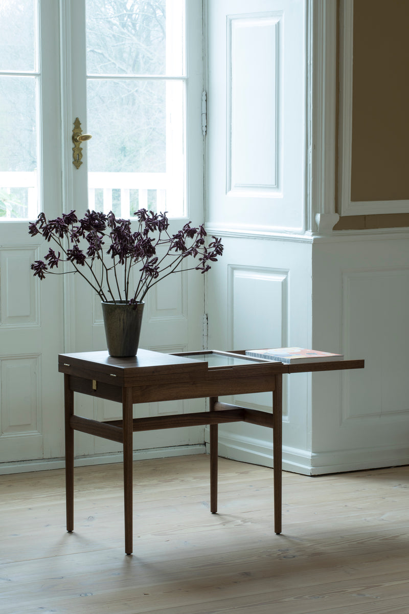 Designed by Finn Juhl in 1948, the Art Collector's Table is just what it sounds like - a piece of art. Ideal in an office or living space, the split tabletop can be unfolded to reveal a glass case for storage underneath. When unfolded, the leaves function as two separate table tops, creating more surface area for whatever your needs may be. It is crafted with American black walnut and has a solid frame and edges with a veneered table top and brass hinges. Precision in every detail is key to the creation of this table.