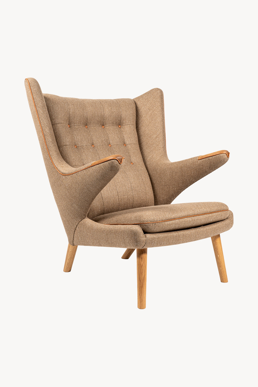The PP19 Papa Bear Chair, designed by Hans J. Wegner in 1951, has become one of his most iconic and inviting designs, celebrated for its exceptional comfort and sculptural beauty. Handcrafted in Denmark with unparalleled craftsmanship, each chair takes over two weeks to complete. Its solid wood frame, made from sustainably sourced materials, ensures durability, while the distinctive "bear paws" armrests provide both support and a playful, organic aesthetic. Expertly upholstered for ultimate comfort, the high backrest and generous cushioning create the perfect balance of luxury and relaxation. The Papa Bear Chair is an investment for a lifetime of hygge moments.